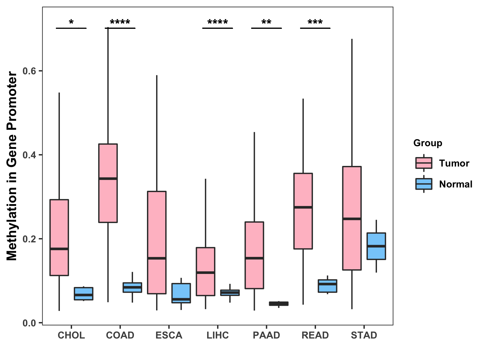 Boxplot of All Gastrointestinal Cancer ( * : 0.01-0.05 , ** : 0.005-0.01 , *** : 0.0001-0.005 , **** : < 0.0001 ) |