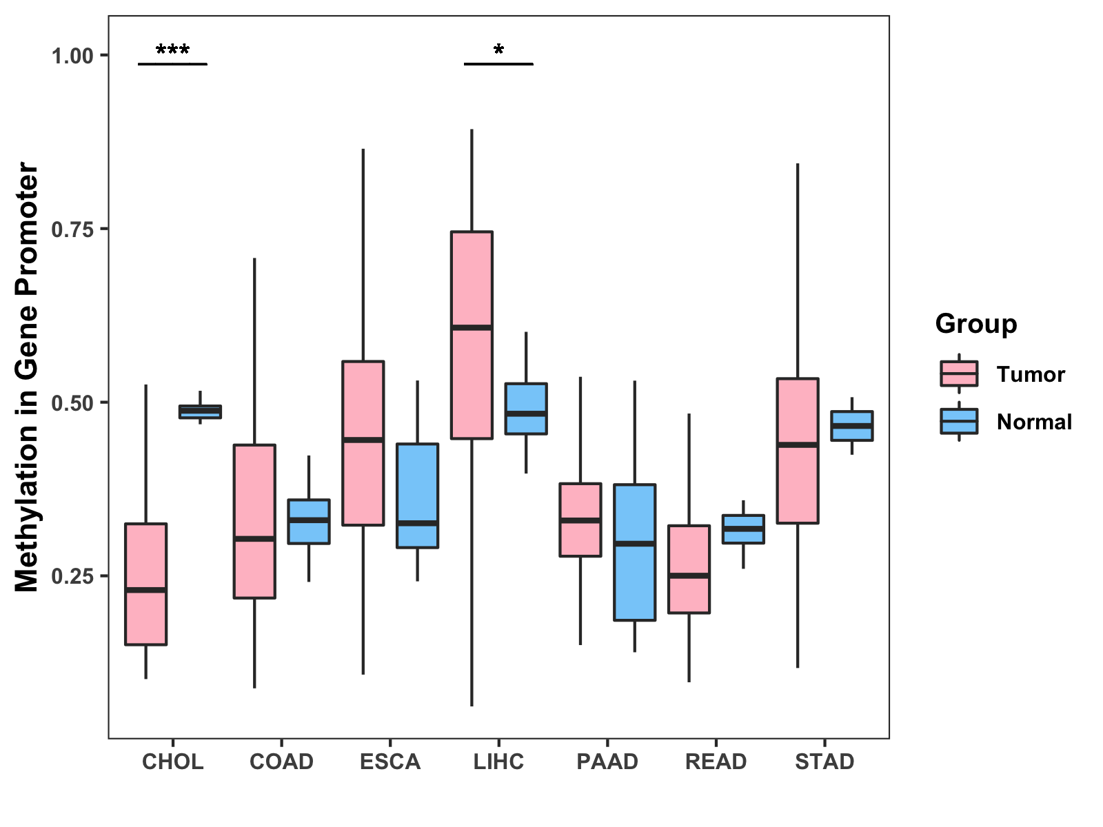 Boxplot of All Gastrointestinal Cancer ( * : 0.01-0.05 , ** : 0.005-0.01 , *** : 0.0001-0.005 , **** : < 0.0001 ) |