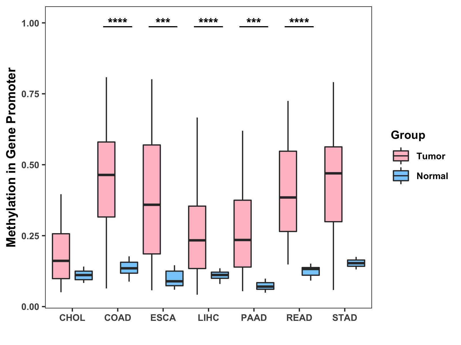 Boxplot of All Gastrointestinal Cancer ( * : 0.01-0.05 , ** : 0.005-0.01 , *** : 0.0001-0.005 , **** : < 0.0001 ) |