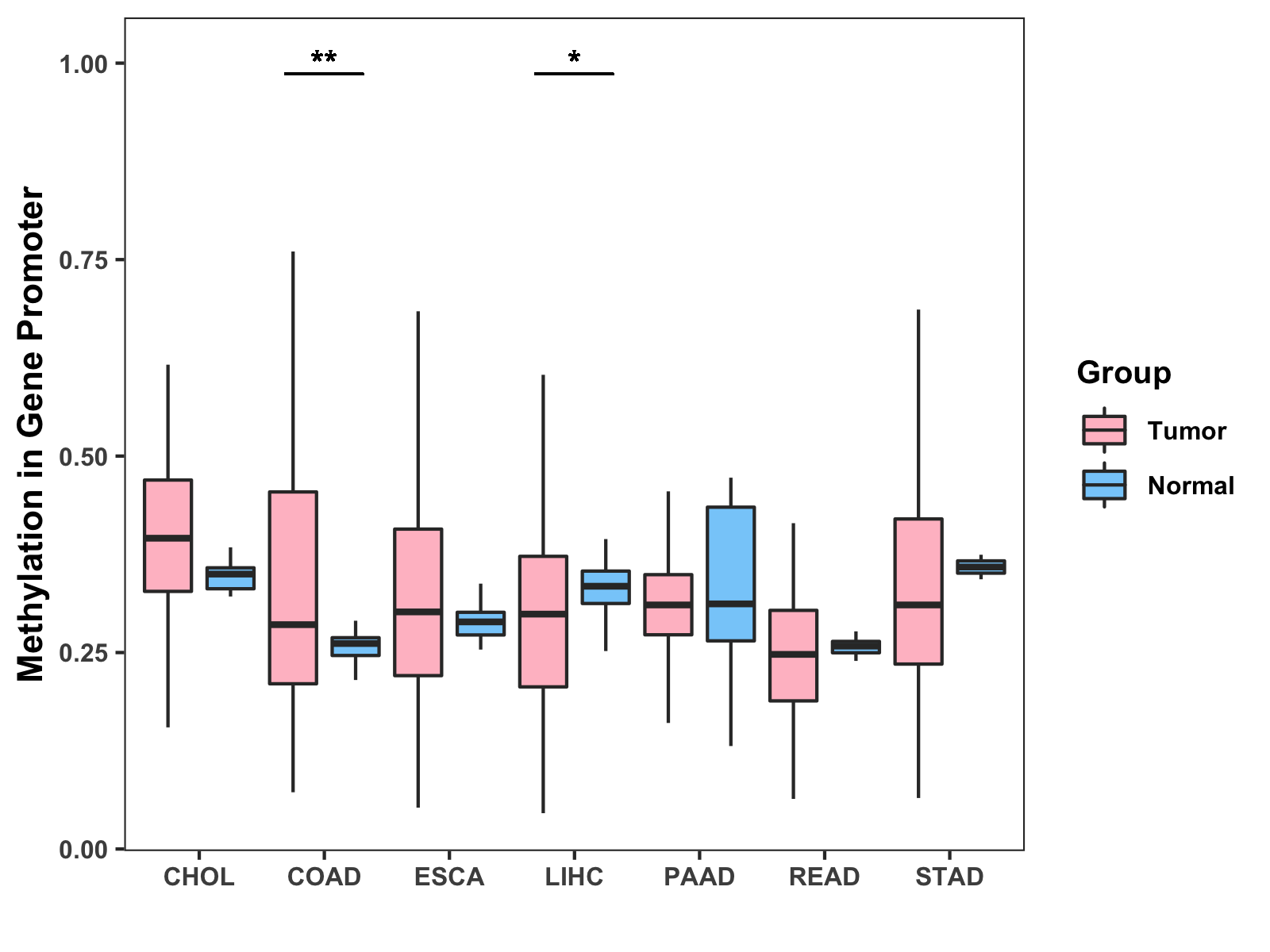 Boxplot of All Gastrointestinal Cancer ( * : 0.01-0.05 , ** : 0.005-0.01 , *** : 0.0001-0.005 , **** : < 0.0001 ) |