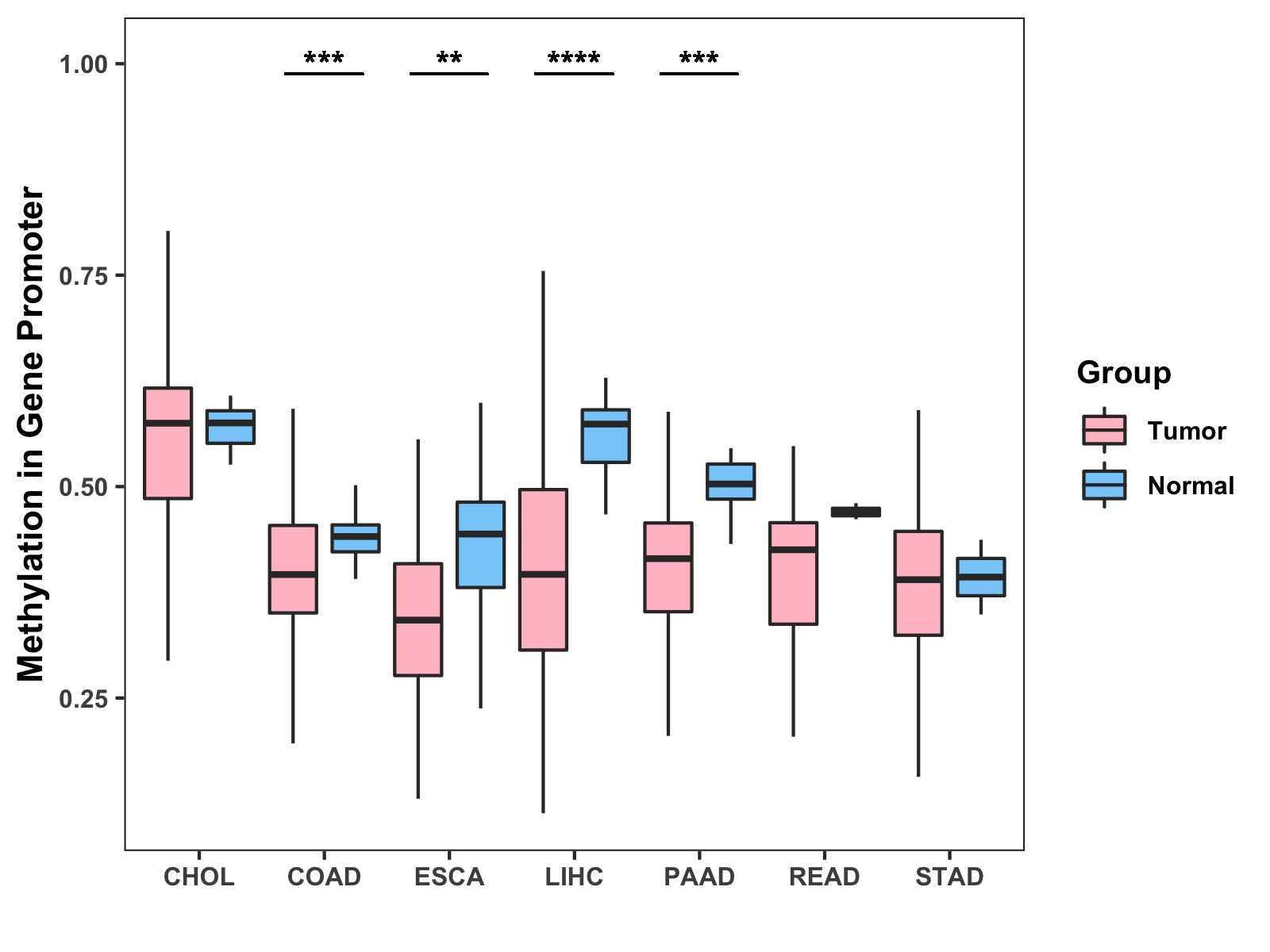 Boxplot of All Gastrointestinal Cancer ( * : 0.01-0.05 , ** : 0.005-0.01 , *** : 0.0001-0.005 , **** : < 0.0001 ) |