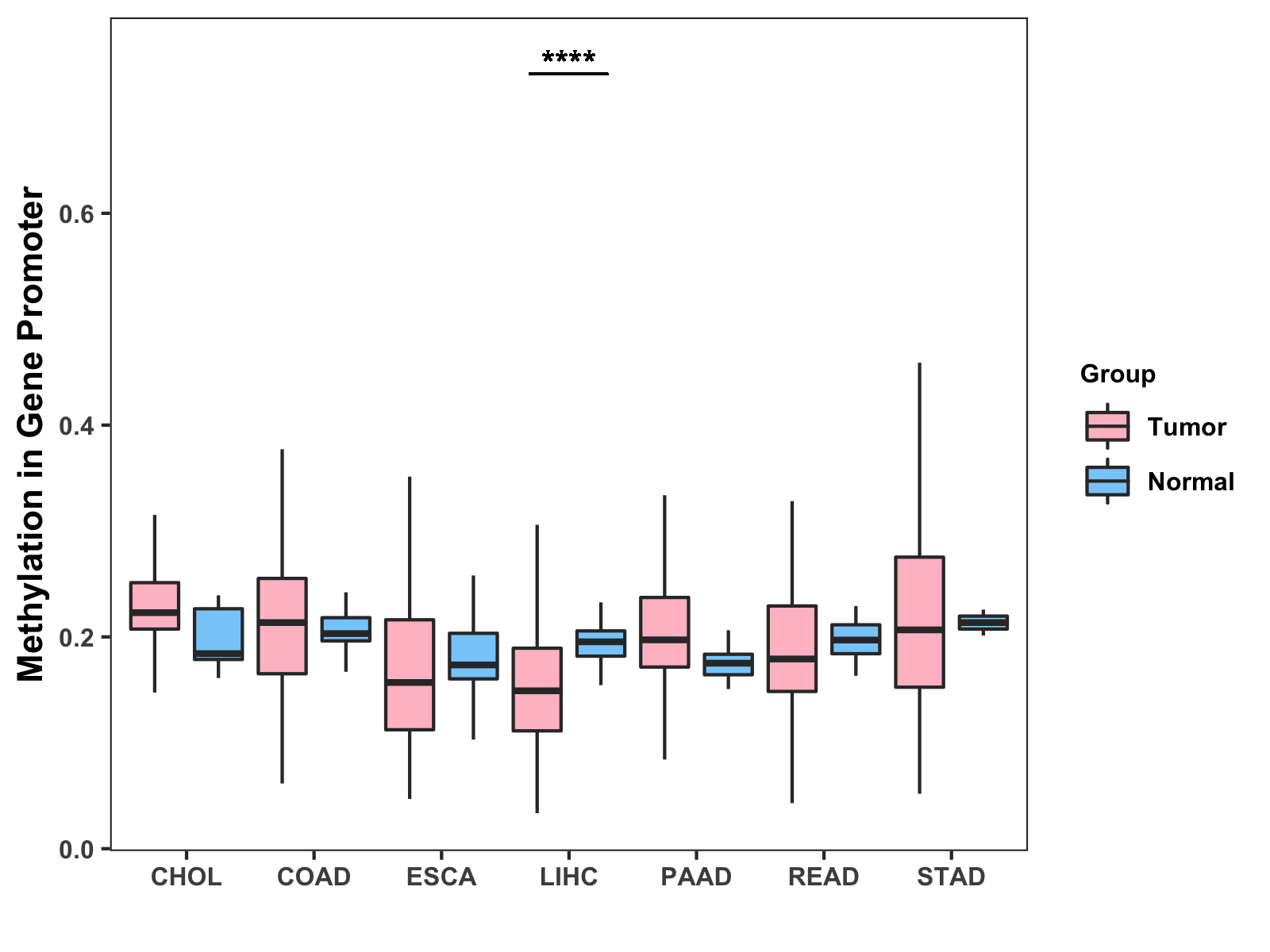 Boxplot of All Gastrointestinal Cancer ( * : 0.01-0.05 , ** : 0.005-0.01 , *** : 0.0001-0.005 , **** : < 0.0001 ) |