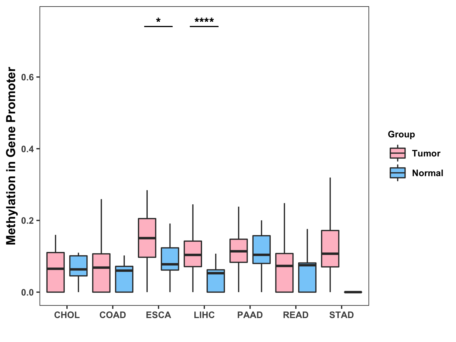 Boxplot of All Gastrointestinal Cancer ( * : 0.01-0.05 , ** : 0.005-0.01 , *** : 0.0001-0.005 , **** : < 0.0001 ) |