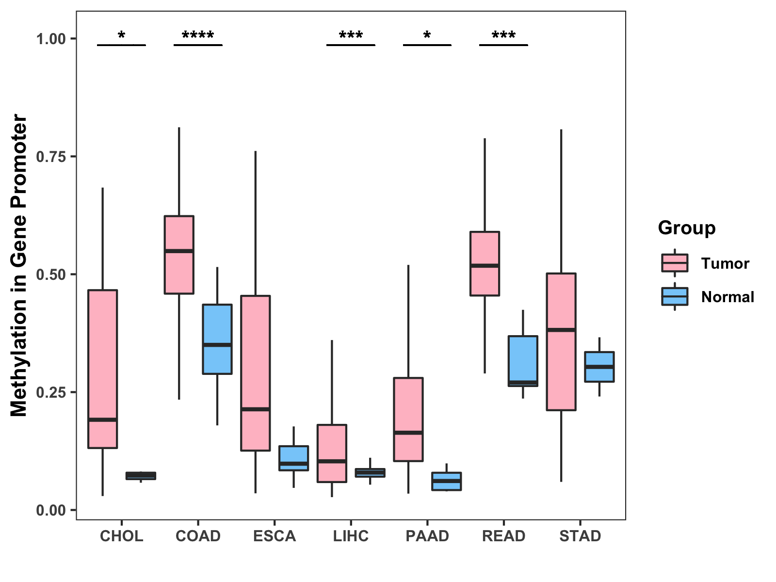 Boxplot of All Gastrointestinal Cancer ( * : 0.01-0.05 , ** : 0.005-0.01 , *** : 0.0001-0.005 , **** : < 0.0001 ) |