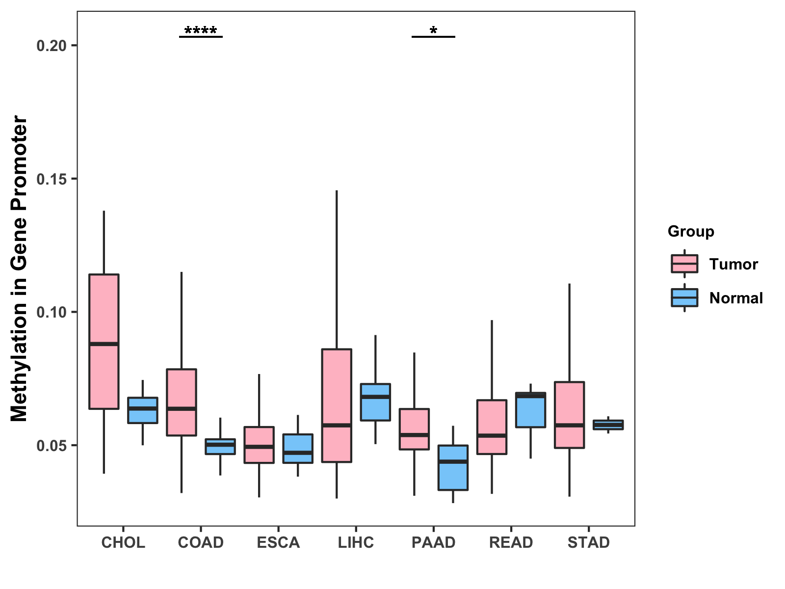 Boxplot of All Gastrointestinal Cancer ( * : 0.01-0.05 , ** : 0.005-0.01 , *** : 0.0001-0.005 , **** : < 0.0001 ) |