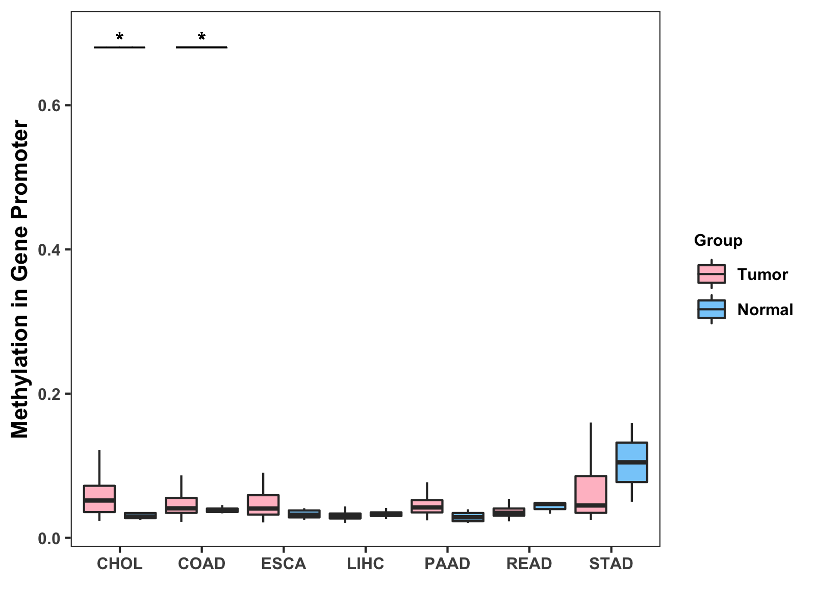 Boxplot of All Gastrointestinal Cancer ( * : 0.01-0.05 , ** : 0.005-0.01 , *** : 0.0001-0.005 , **** : < 0.0001 ) |