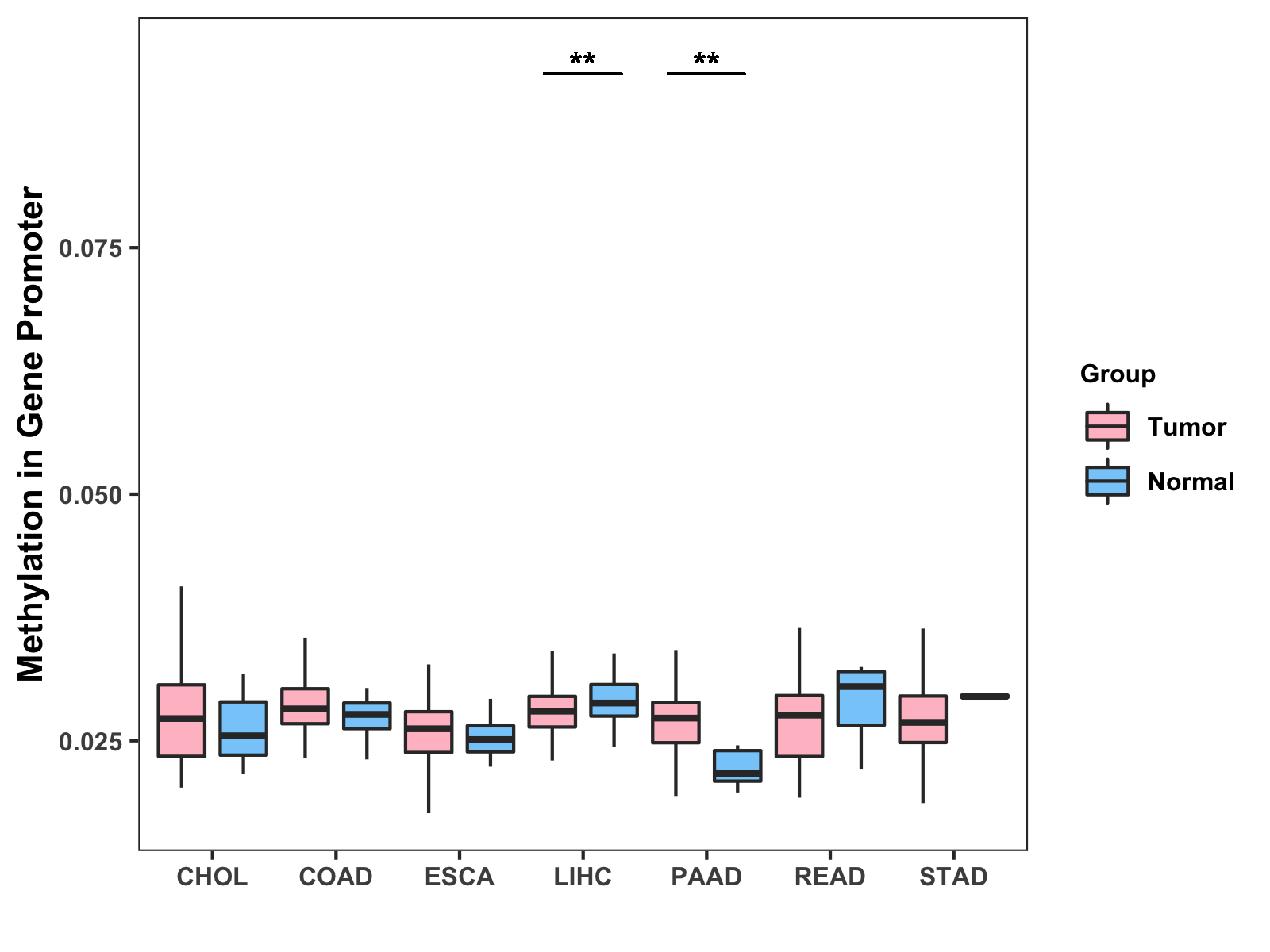 Boxplot of All Gastrointestinal Cancer ( * : 0.01-0.05 , ** : 0.005-0.01 , *** : 0.0001-0.005 , **** : < 0.0001 ) |