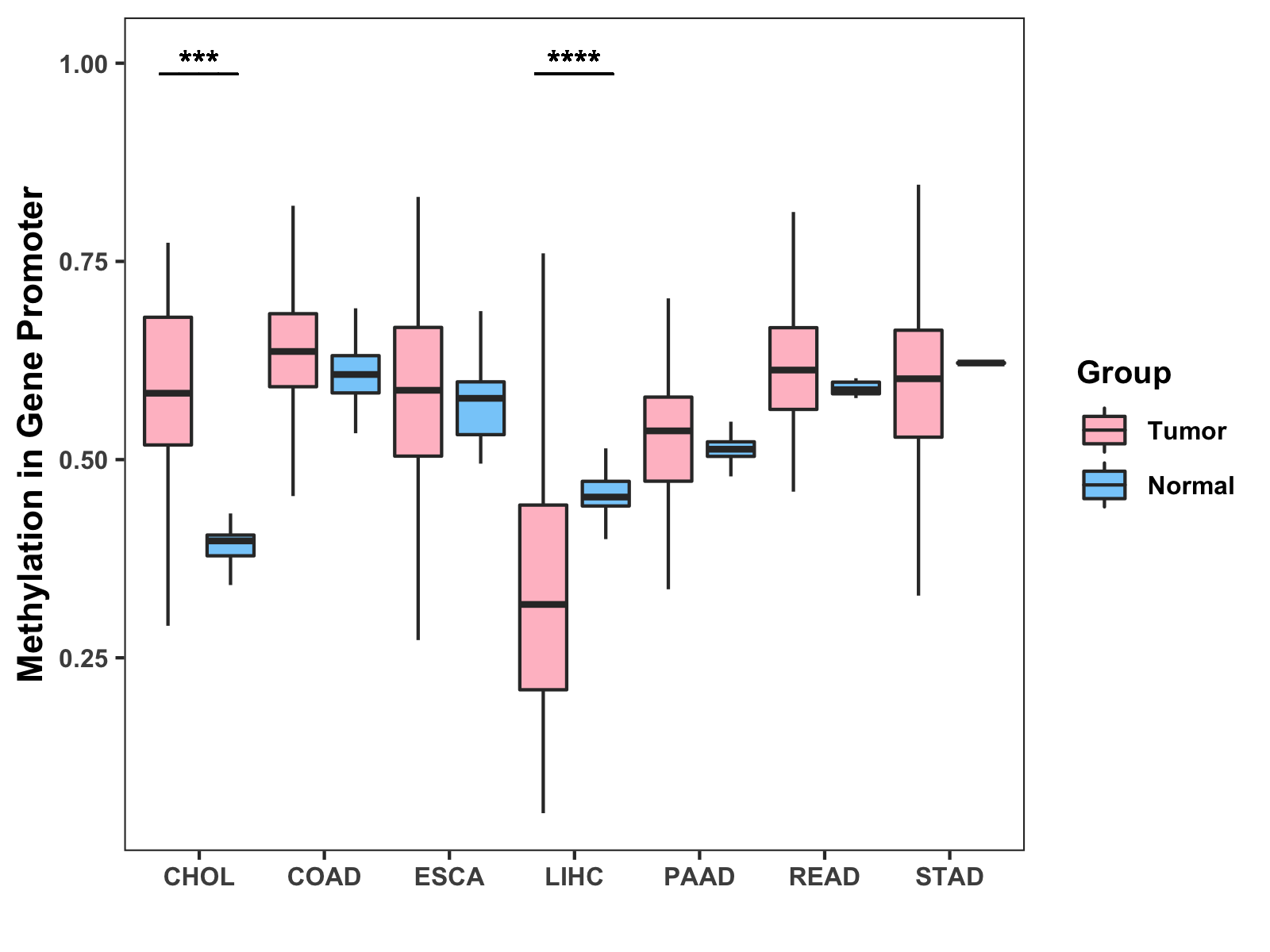 Boxplot of All Gastrointestinal Cancer ( * : 0.01-0.05 , ** : 0.005-0.01 , *** : 0.0001-0.005 , **** : < 0.0001 ) |