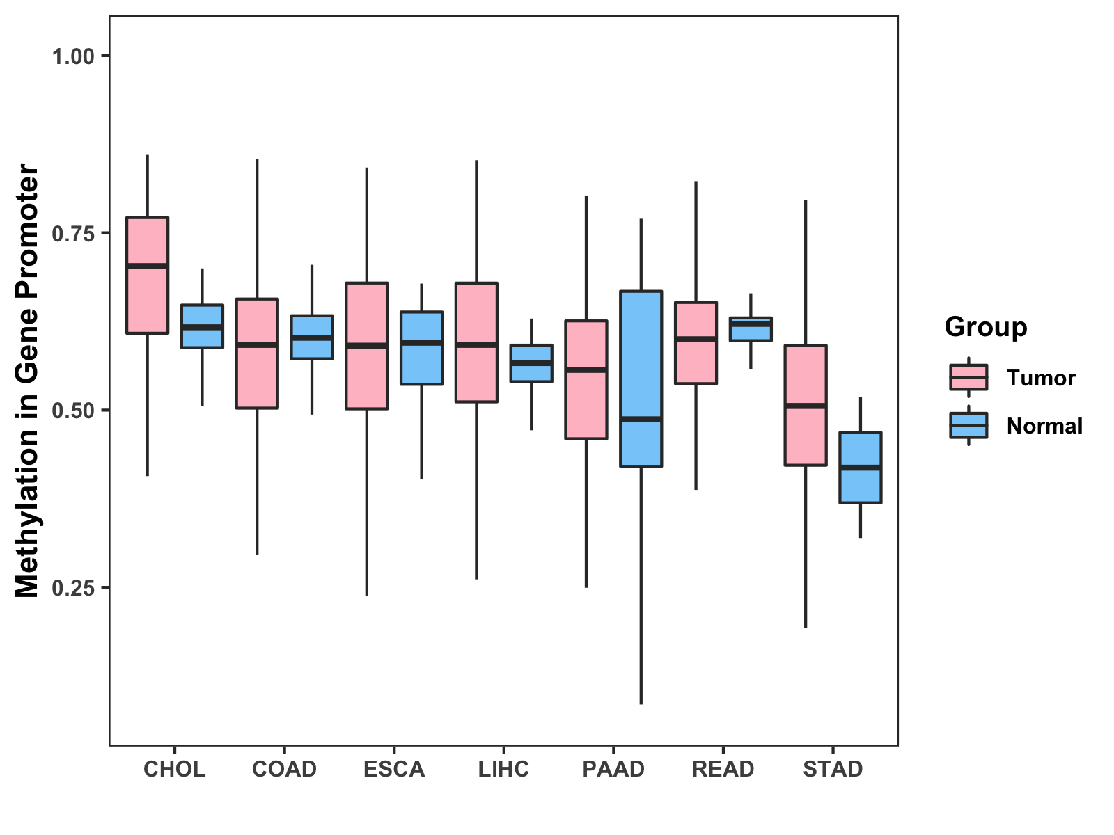 Boxplot of All Gastrointestinal Cancer ( * : 0.01-0.05 , ** : 0.005-0.01 , *** : 0.0001-0.005 , **** : < 0.0001 ) |