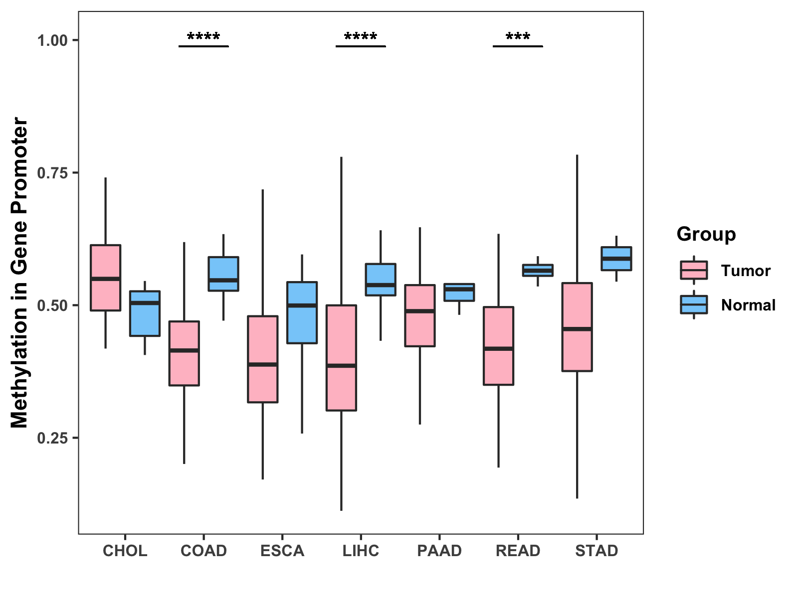 Boxplot of All Gastrointestinal Cancer ( * : 0.01-0.05 , ** : 0.005-0.01 , *** : 0.0001-0.005 , **** : < 0.0001 ) |