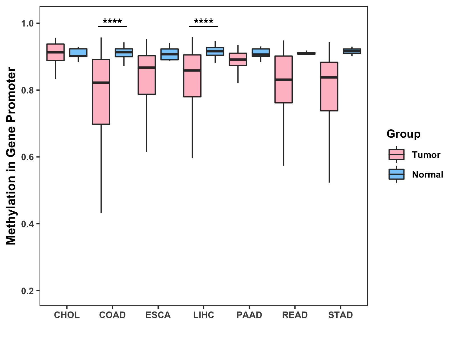 Boxplot of All Gastrointestinal Cancer ( * : 0.01-0.05 , ** : 0.005-0.01 , *** : 0.0001-0.005 , **** : < 0.0001 ) |