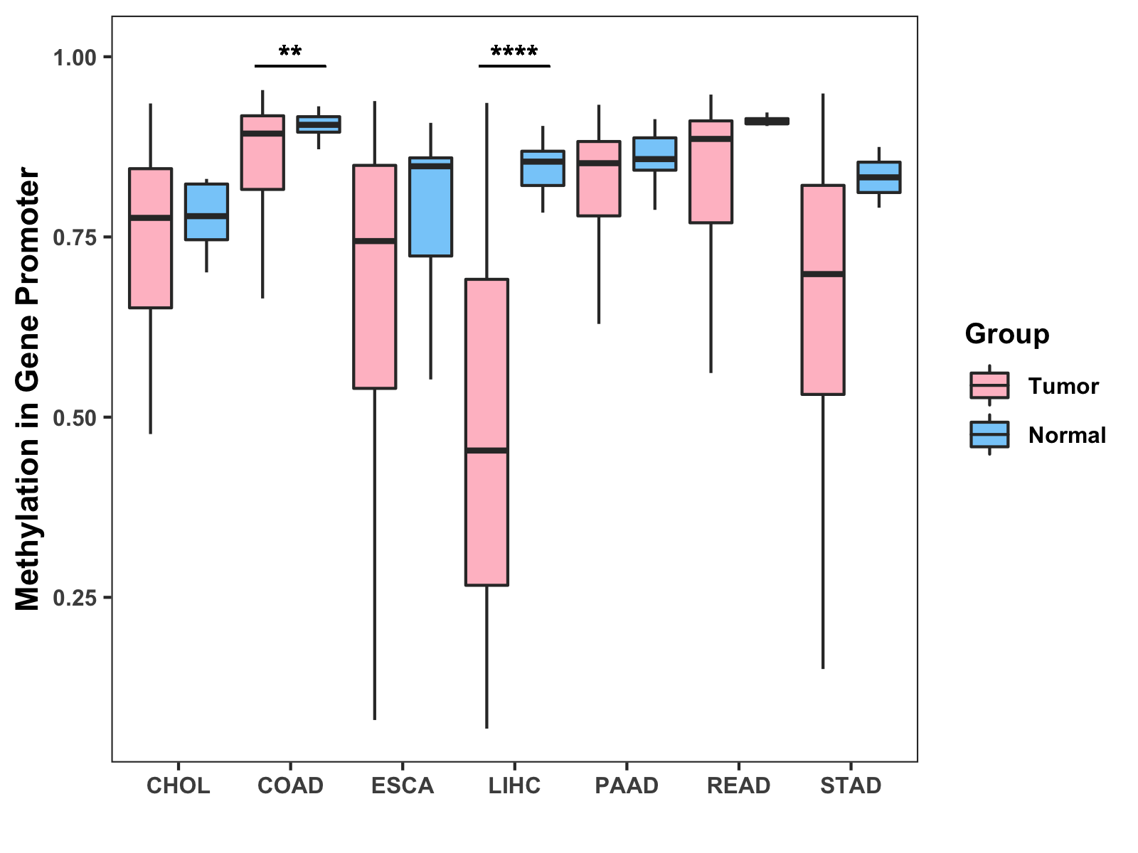 Boxplot of All Gastrointestinal Cancer ( * : 0.01-0.05 , ** : 0.005-0.01 , *** : 0.0001-0.005 , **** : < 0.0001 ) |