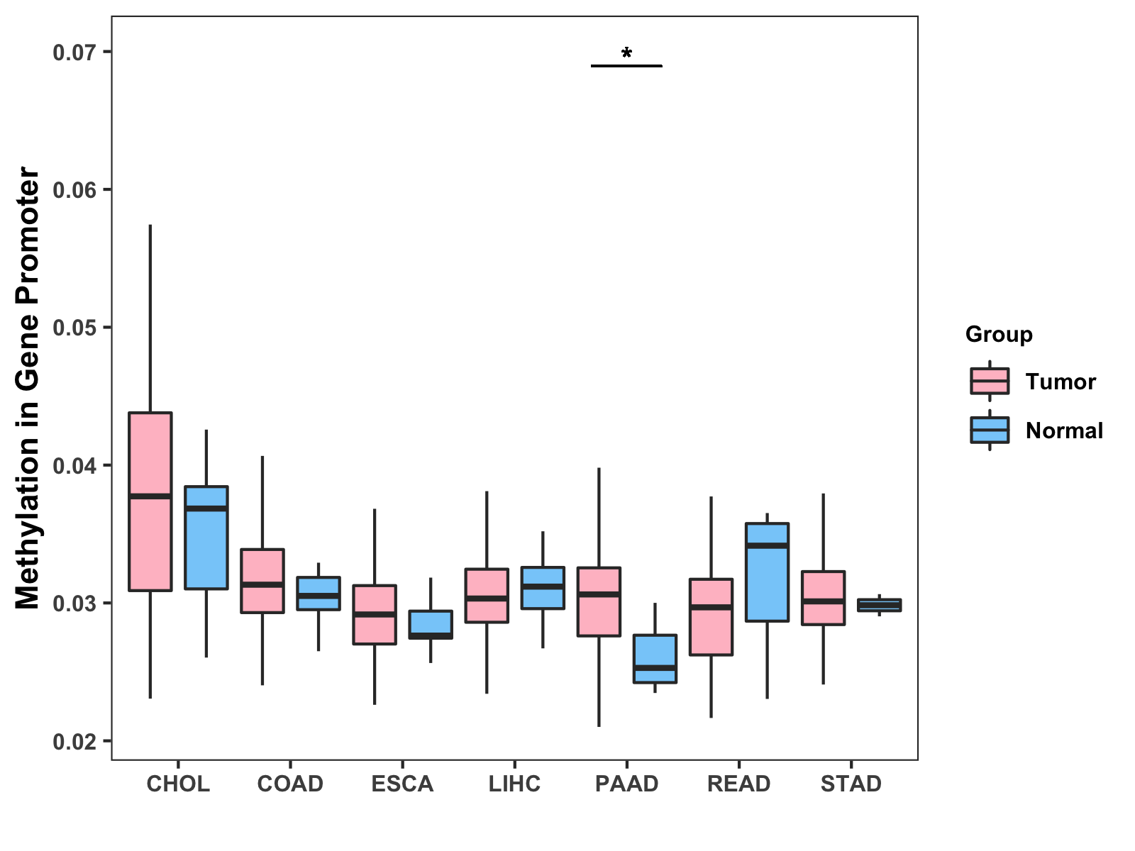 Boxplot of All Gastrointestinal Cancer ( * : 0.01-0.05 , ** : 0.005-0.01 , *** : 0.0001-0.005 , **** : < 0.0001 ) |