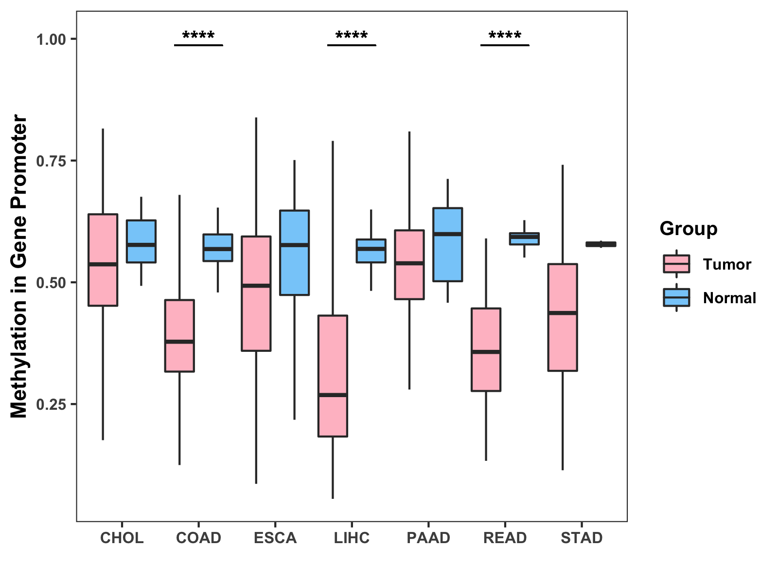 Boxplot of All Gastrointestinal Cancer ( * : 0.01-0.05 , ** : 0.005-0.01 , *** : 0.0001-0.005 , **** : < 0.0001 ) |