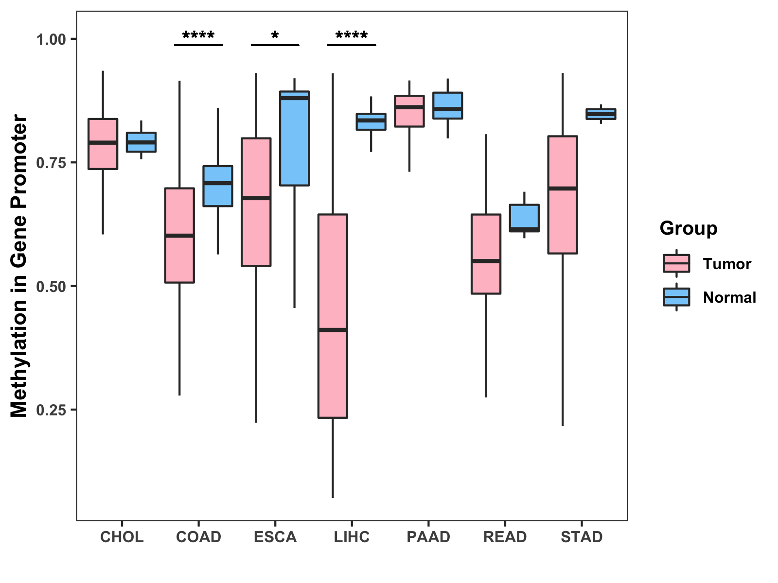 Boxplot of All Gastrointestinal Cancer ( * : 0.01-0.05 , ** : 0.005-0.01 , *** : 0.0001-0.005 , **** : < 0.0001 ) |