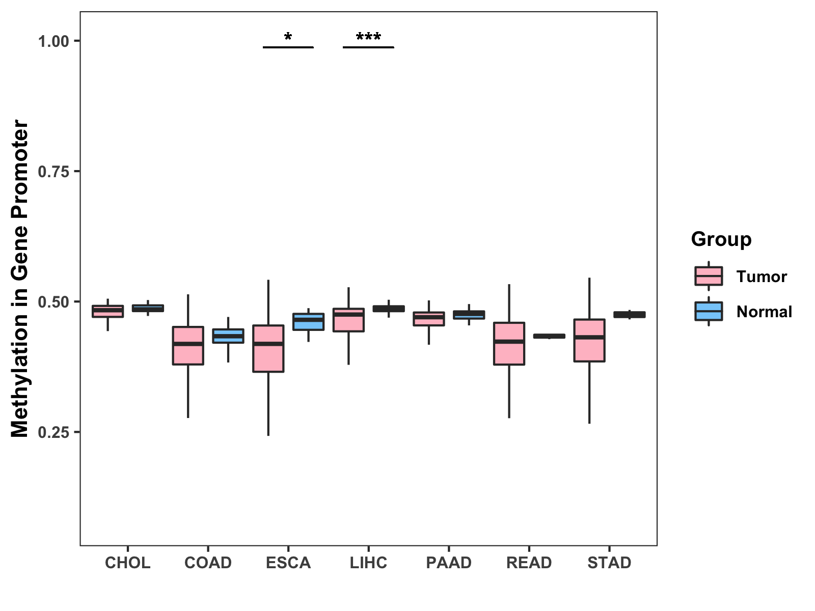 Boxplot of All Gastrointestinal Cancer ( * : 0.01-0.05 , ** : 0.005-0.01 , *** : 0.0001-0.005 , **** : < 0.0001 ) |