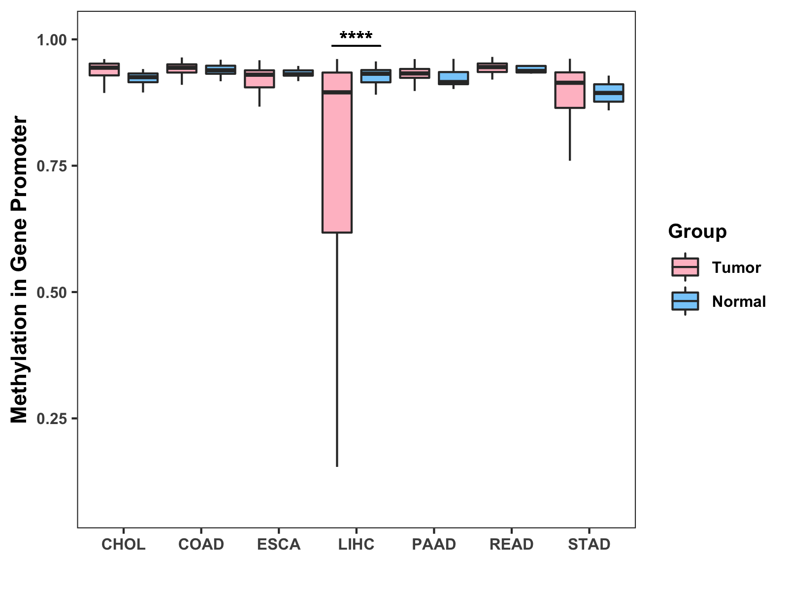 Boxplot of All Gastrointestinal Cancer ( * : 0.01-0.05 , ** : 0.005-0.01 , *** : 0.0001-0.005 , **** : < 0.0001 ) |