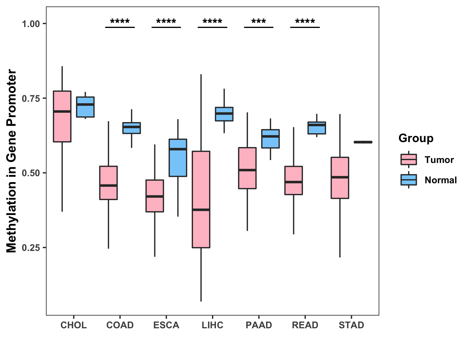 Boxplot of All Gastrointestinal Cancer ( * : 0.01-0.05 , ** : 0.005-0.01 , *** : 0.0001-0.005 , **** : < 0.0001 ) |