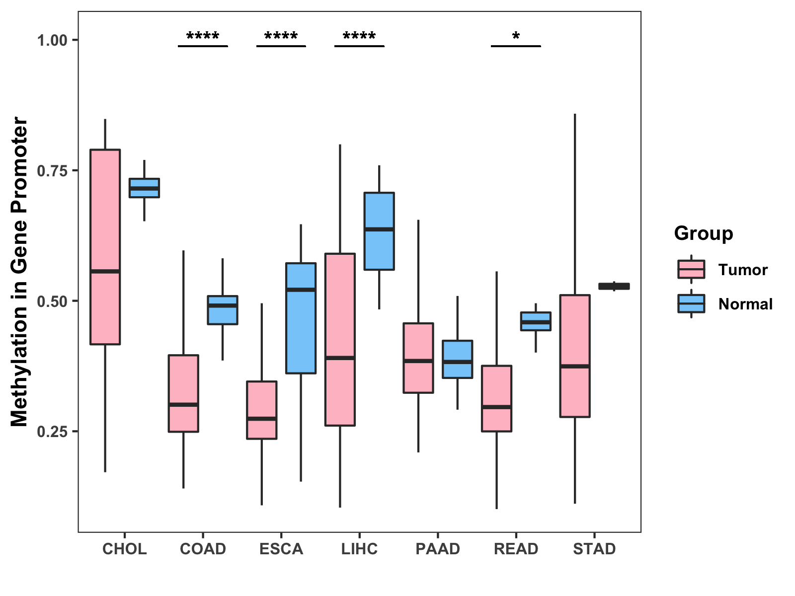 Boxplot of All Gastrointestinal Cancer ( * : 0.01-0.05 , ** : 0.005-0.01 , *** : 0.0001-0.005 , **** : < 0.0001 ) |
