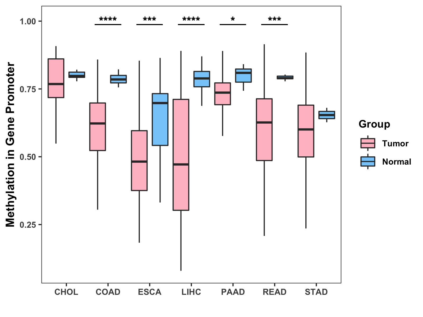 Boxplot of All Gastrointestinal Cancer ( * : 0.01-0.05 , ** : 0.005-0.01 , *** : 0.0001-0.005 , **** : < 0.0001 ) |