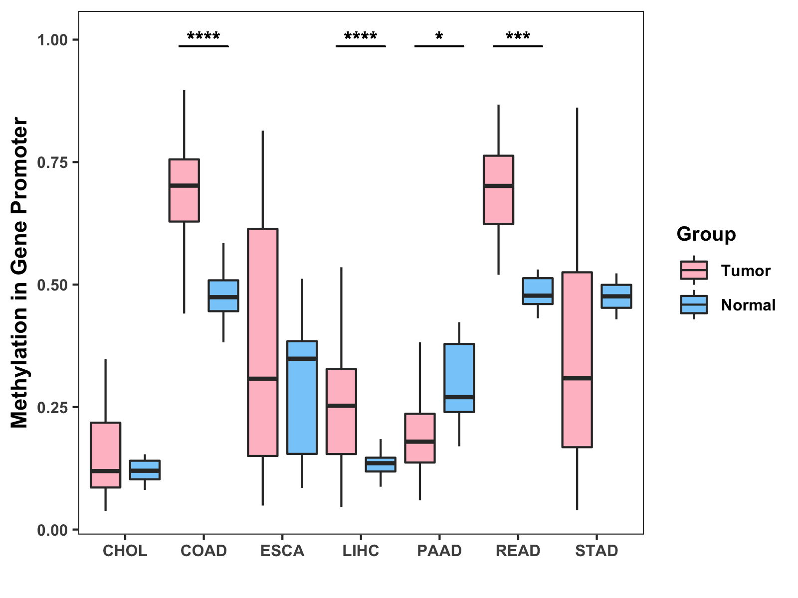 Boxplot of All Gastrointestinal Cancer ( * : 0.01-0.05 , ** : 0.005-0.01 , *** : 0.0001-0.005 , **** : < 0.0001 ) |