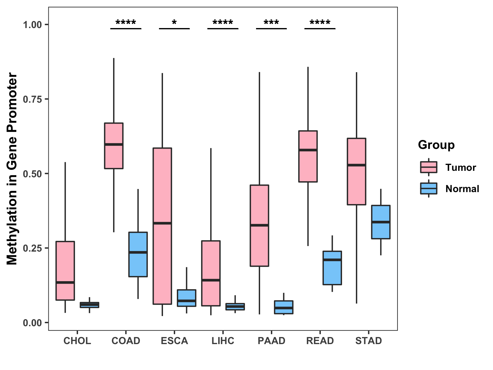 Boxplot of All Gastrointestinal Cancer ( * : 0.01-0.05 , ** : 0.005-0.01 , *** : 0.0001-0.005 , **** : < 0.0001 ) |