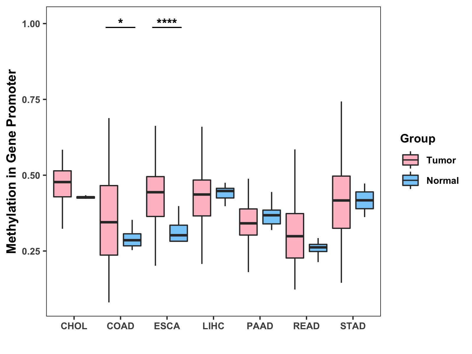 Boxplot of All Gastrointestinal Cancer ( * : 0.01-0.05 , ** : 0.005-0.01 , *** : 0.0001-0.005 , **** : < 0.0001 ) |