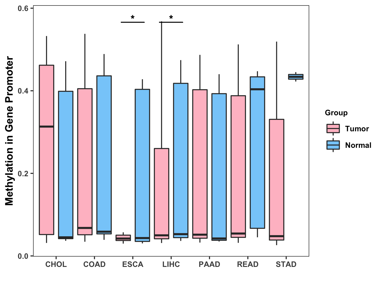 Boxplot of All Gastrointestinal Cancer ( * : 0.01-0.05 , ** : 0.005-0.01 , *** : 0.0001-0.005 , **** : < 0.0001 ) |