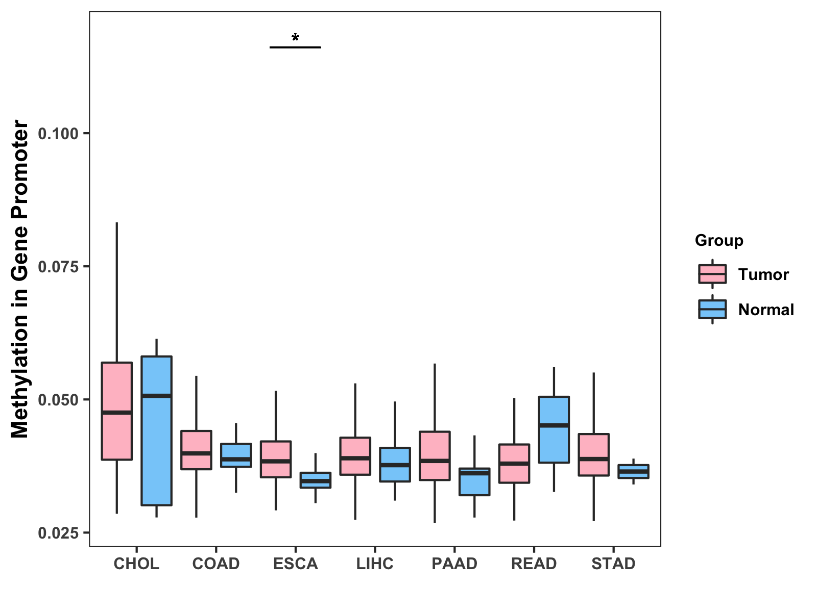 Boxplot of All Gastrointestinal Cancer ( * : 0.01-0.05 , ** : 0.005-0.01 , *** : 0.0001-0.005 , **** : < 0.0001 ) |