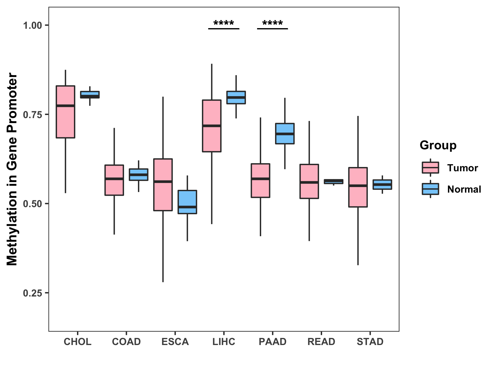 Boxplot of All Gastrointestinal Cancer ( * : 0.01-0.05 , ** : 0.005-0.01 , *** : 0.0001-0.005 , **** : < 0.0001 ) |