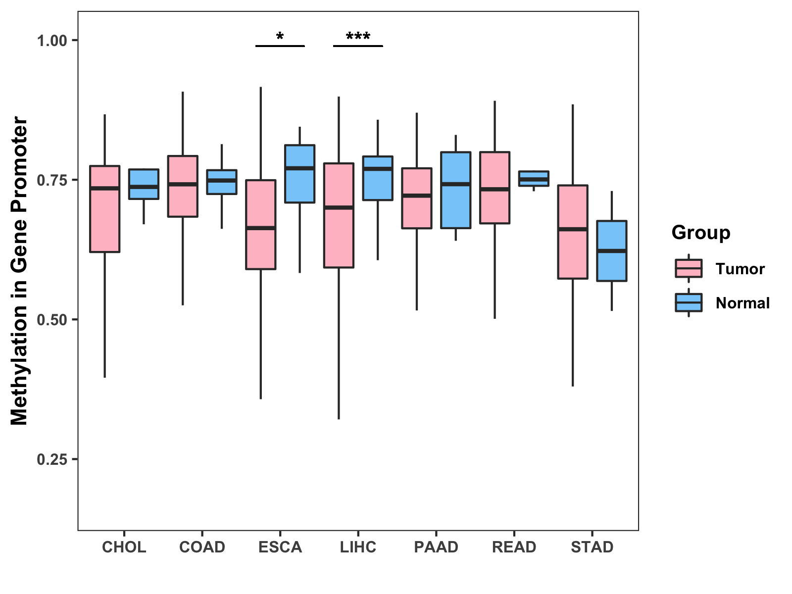 Boxplot of All Gastrointestinal Cancer ( * : 0.01-0.05 , ** : 0.005-0.01 , *** : 0.0001-0.005 , **** : < 0.0001 ) |