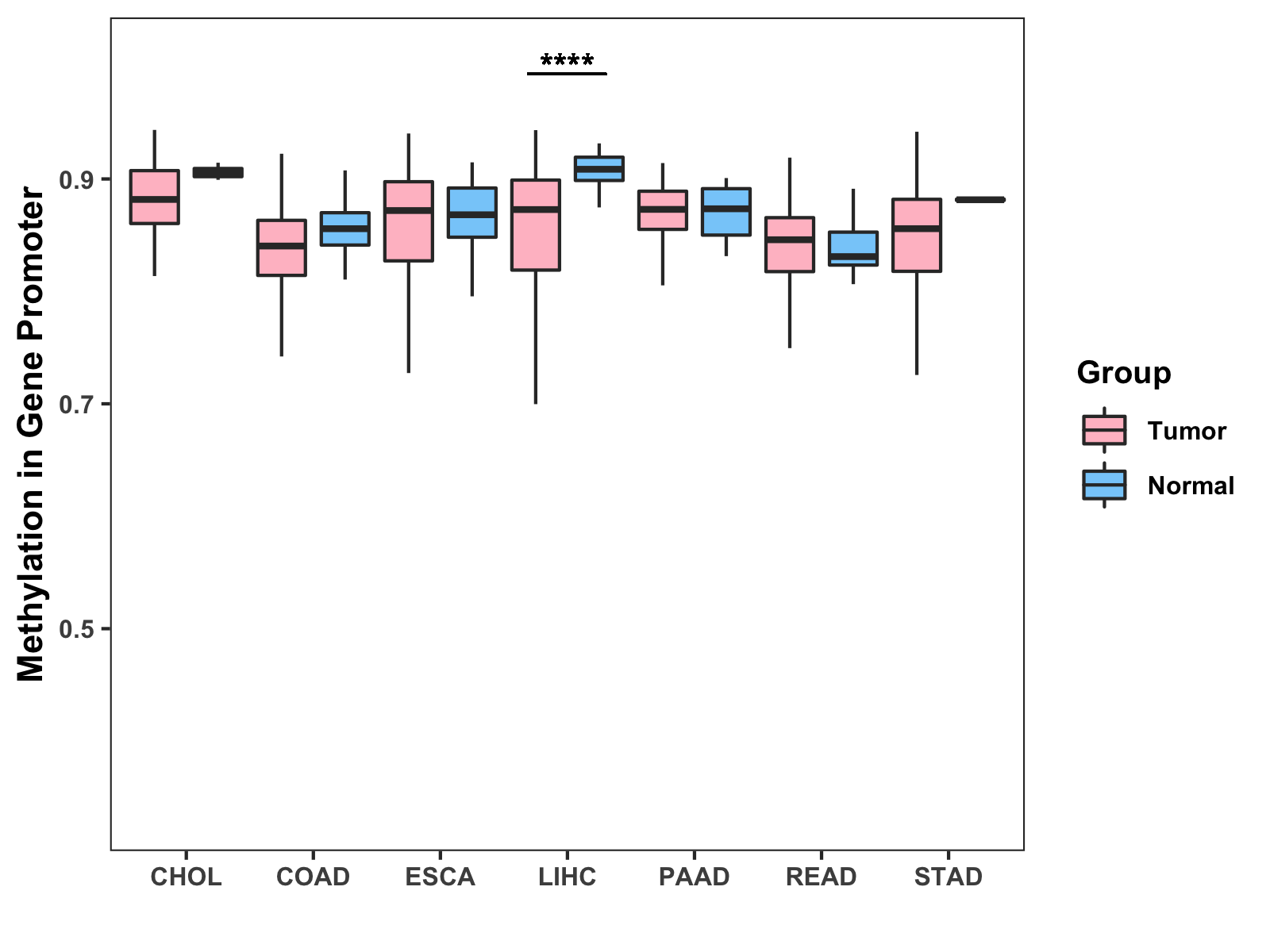 Boxplot of All Gastrointestinal Cancer ( * : 0.01-0.05 , ** : 0.005-0.01 , *** : 0.0001-0.005 , **** : < 0.0001 ) |
