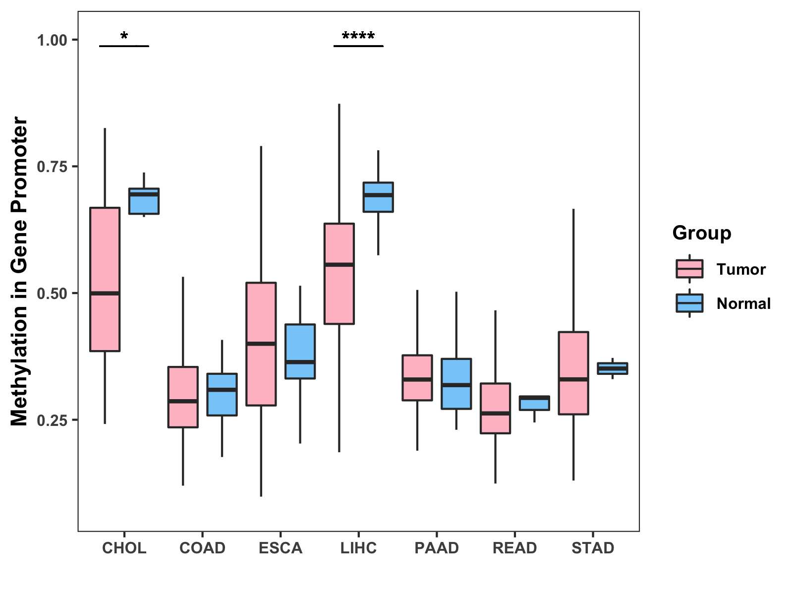 Boxplot of All Gastrointestinal Cancer ( * : 0.01-0.05 , ** : 0.005-0.01 , *** : 0.0001-0.005 , **** : < 0.0001 ) |