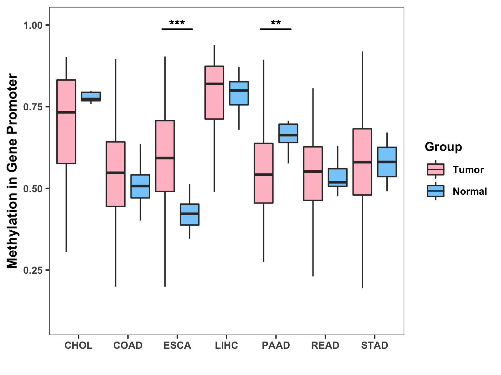 Boxplot of All Gastrointestinal Cancer ( * : 0.01-0.05 , ** : 0.005-0.01 , *** : 0.0001-0.005 , **** : < 0.0001 ) |