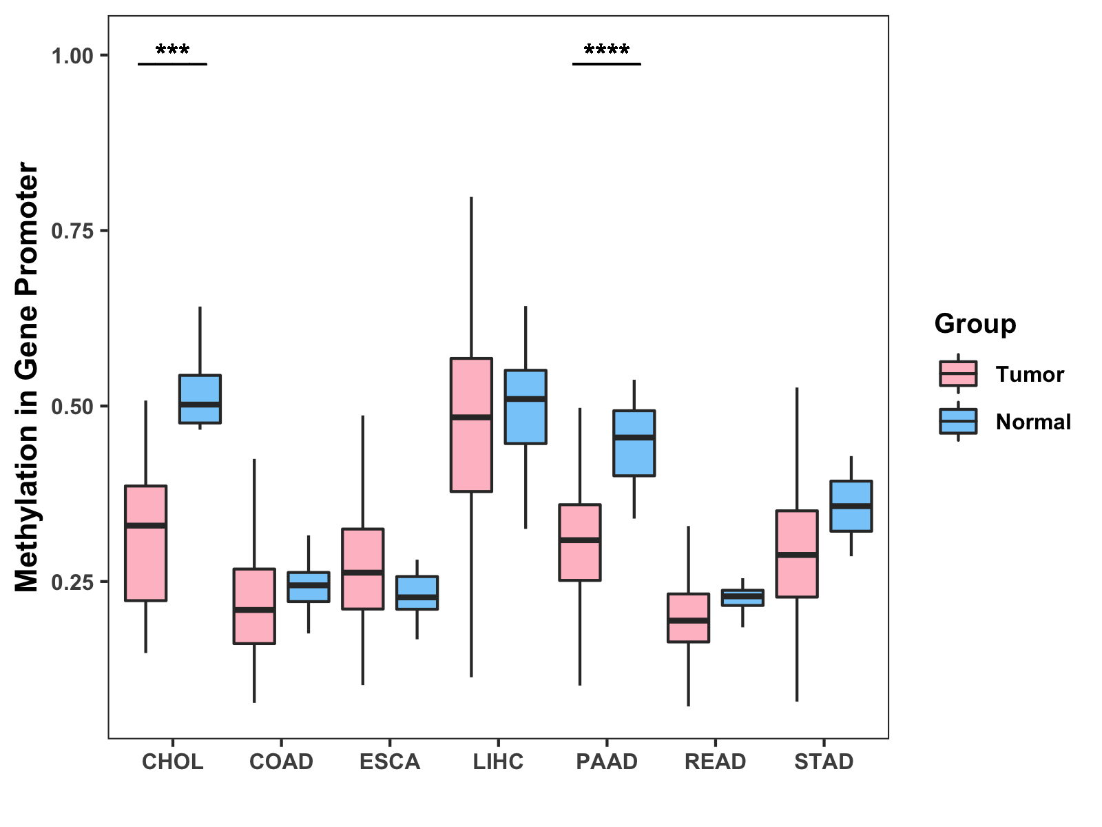 Boxplot of All Gastrointestinal Cancer ( * : 0.01-0.05 , ** : 0.005-0.01 , *** : 0.0001-0.005 , **** : < 0.0001 ) |