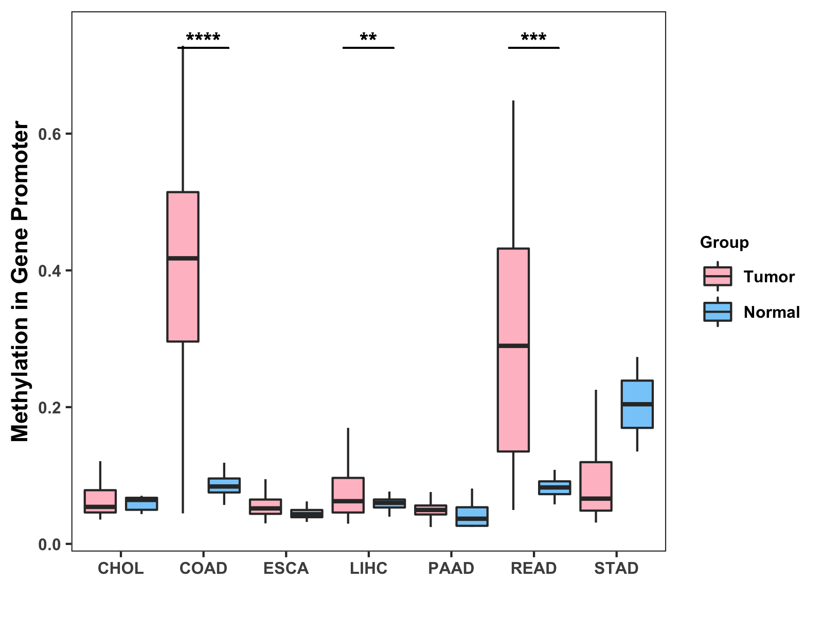 Boxplot of All Gastrointestinal Cancer ( * : 0.01-0.05 , ** : 0.005-0.01 , *** : 0.0001-0.005 , **** : < 0.0001 ) |