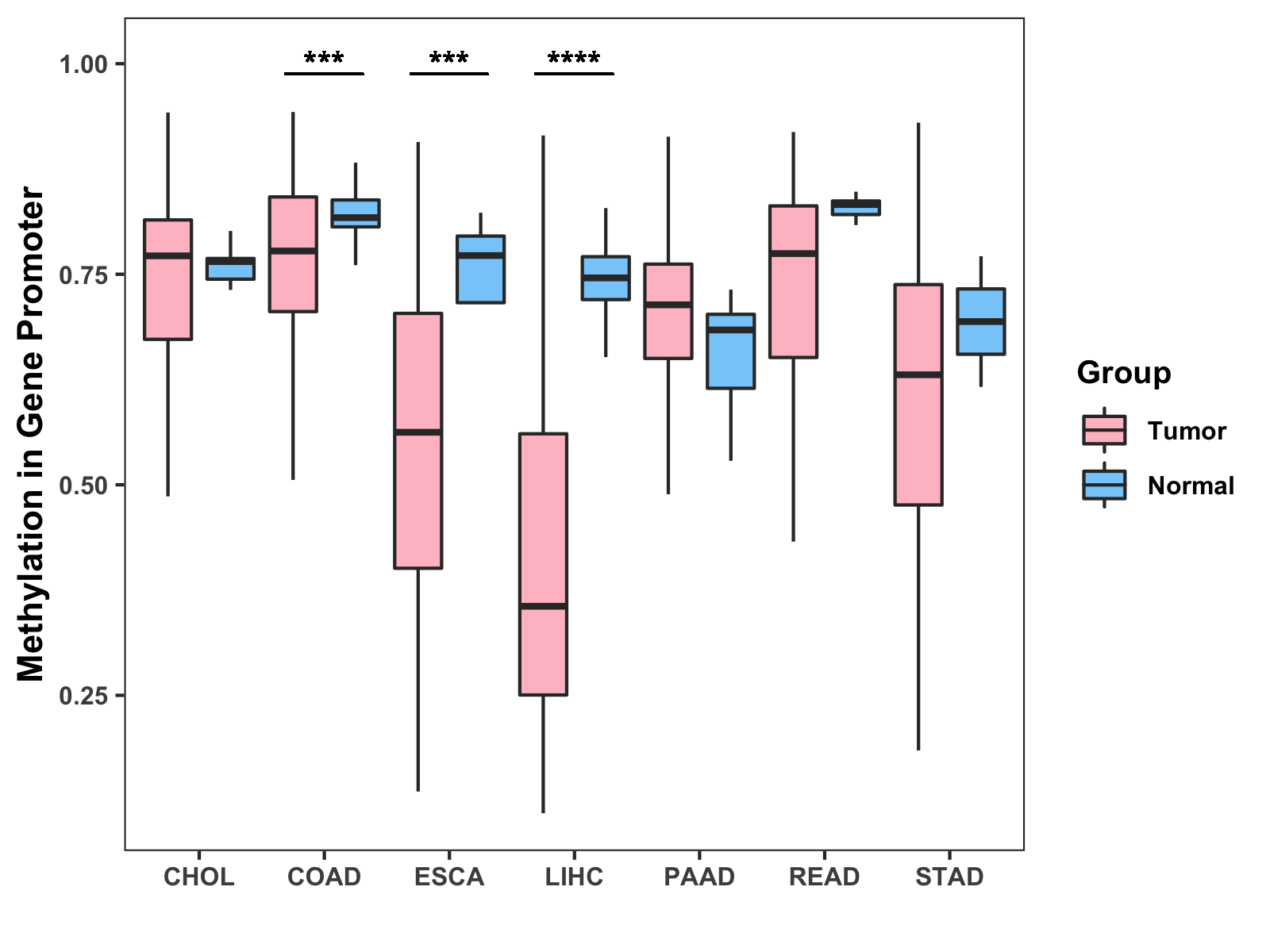 Boxplot of All Gastrointestinal Cancer ( * : 0.01-0.05 , ** : 0.005-0.01 , *** : 0.0001-0.005 , **** : < 0.0001 ) |