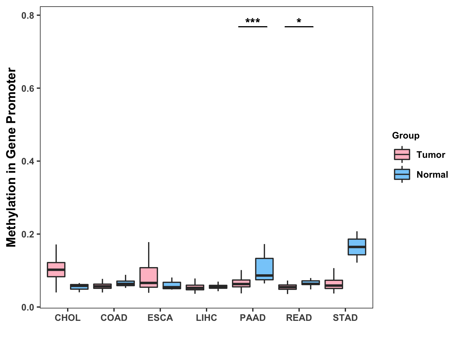 Boxplot of All Gastrointestinal Cancer ( * : 0.01-0.05 , ** : 0.005-0.01 , *** : 0.0001-0.005 , **** : < 0.0001 ) |