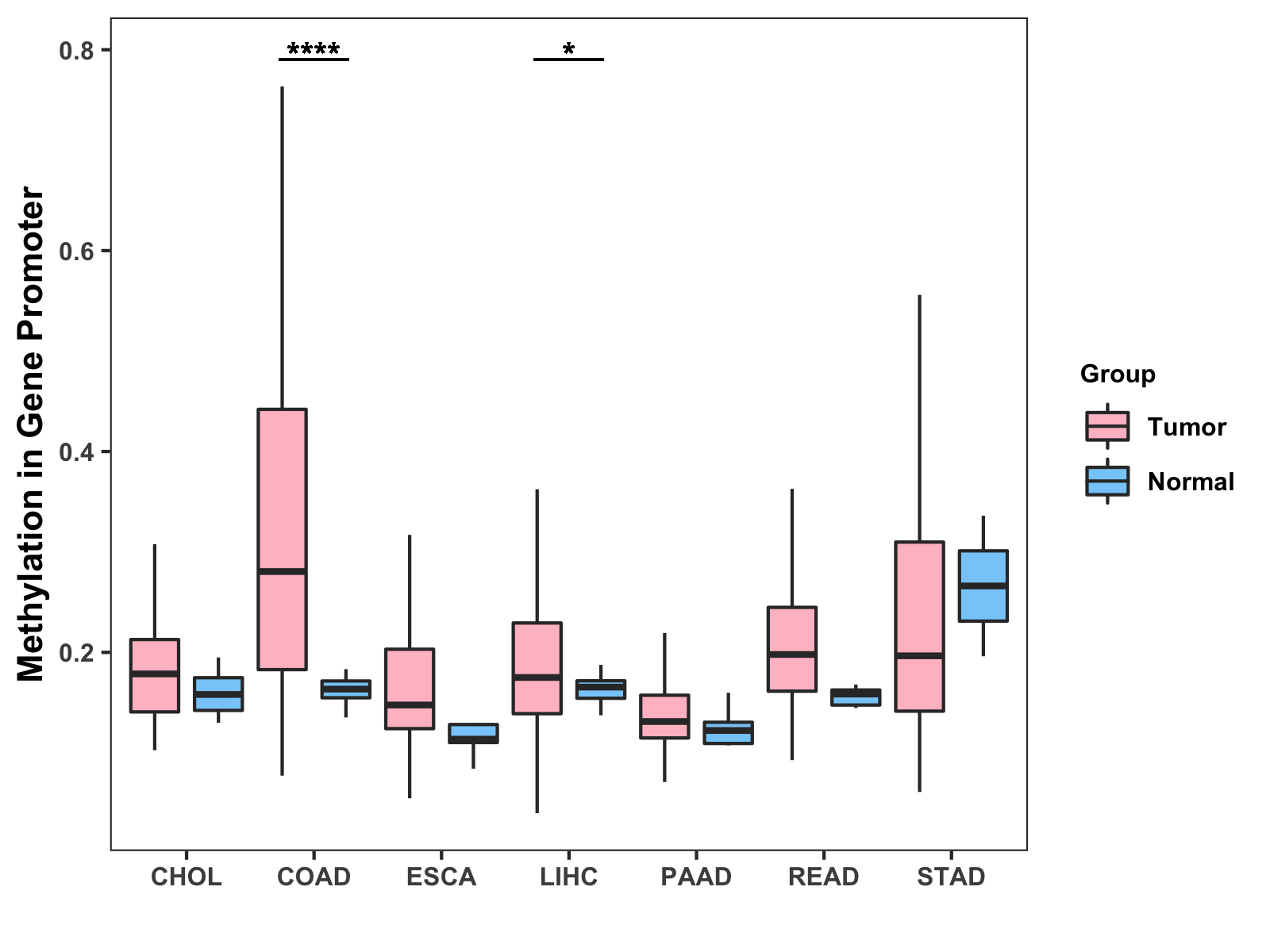 Boxplot of All Gastrointestinal Cancer ( * : 0.01-0.05 , ** : 0.005-0.01 , *** : 0.0001-0.005 , **** : < 0.0001 ) |