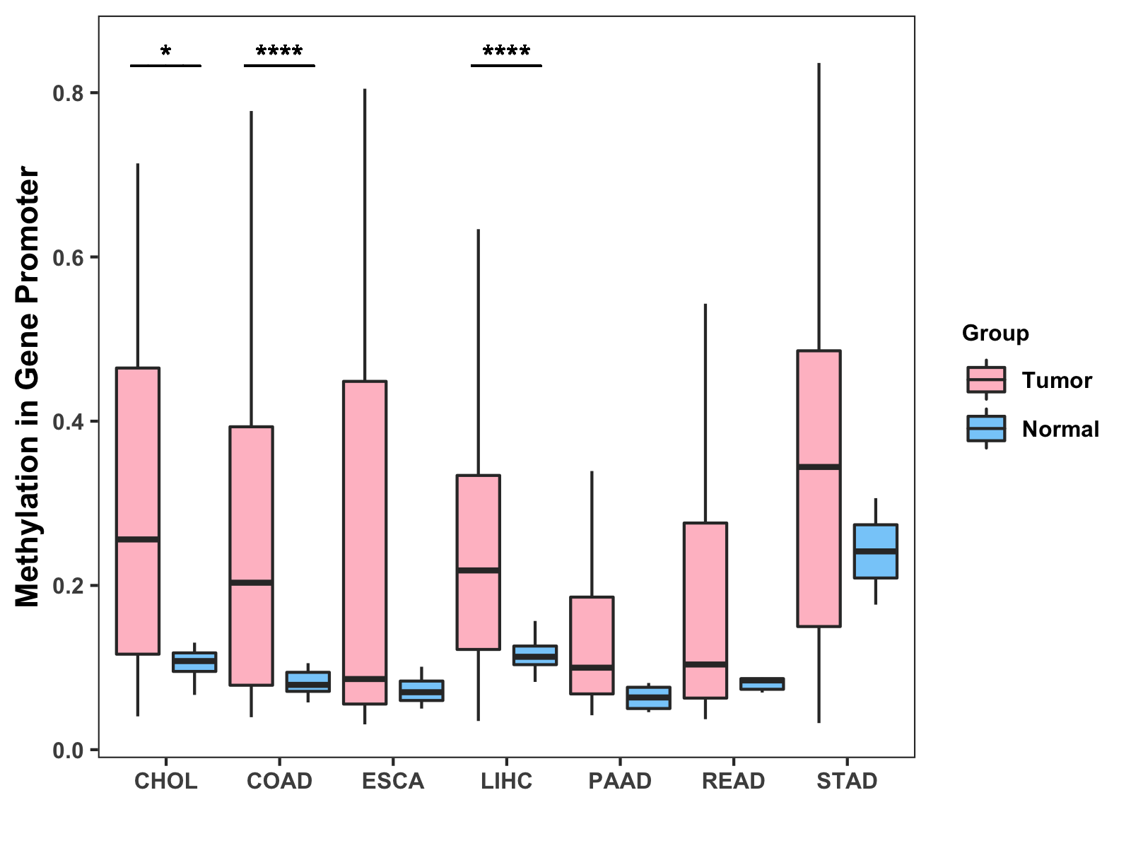 Boxplot of All Gastrointestinal Cancer ( * : 0.01-0.05 , ** : 0.005-0.01 , *** : 0.0001-0.005 , **** : < 0.0001 ) |