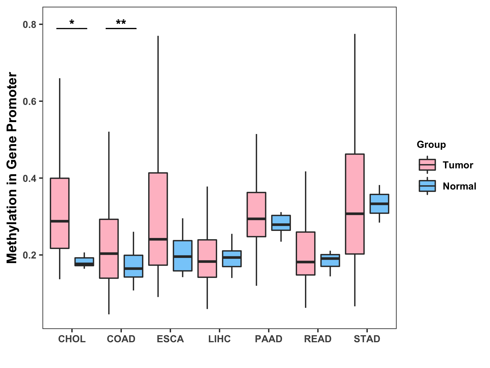Boxplot of All Gastrointestinal Cancer ( * : 0.01-0.05 , ** : 0.005-0.01 , *** : 0.0001-0.005 , **** : < 0.0001 ) |