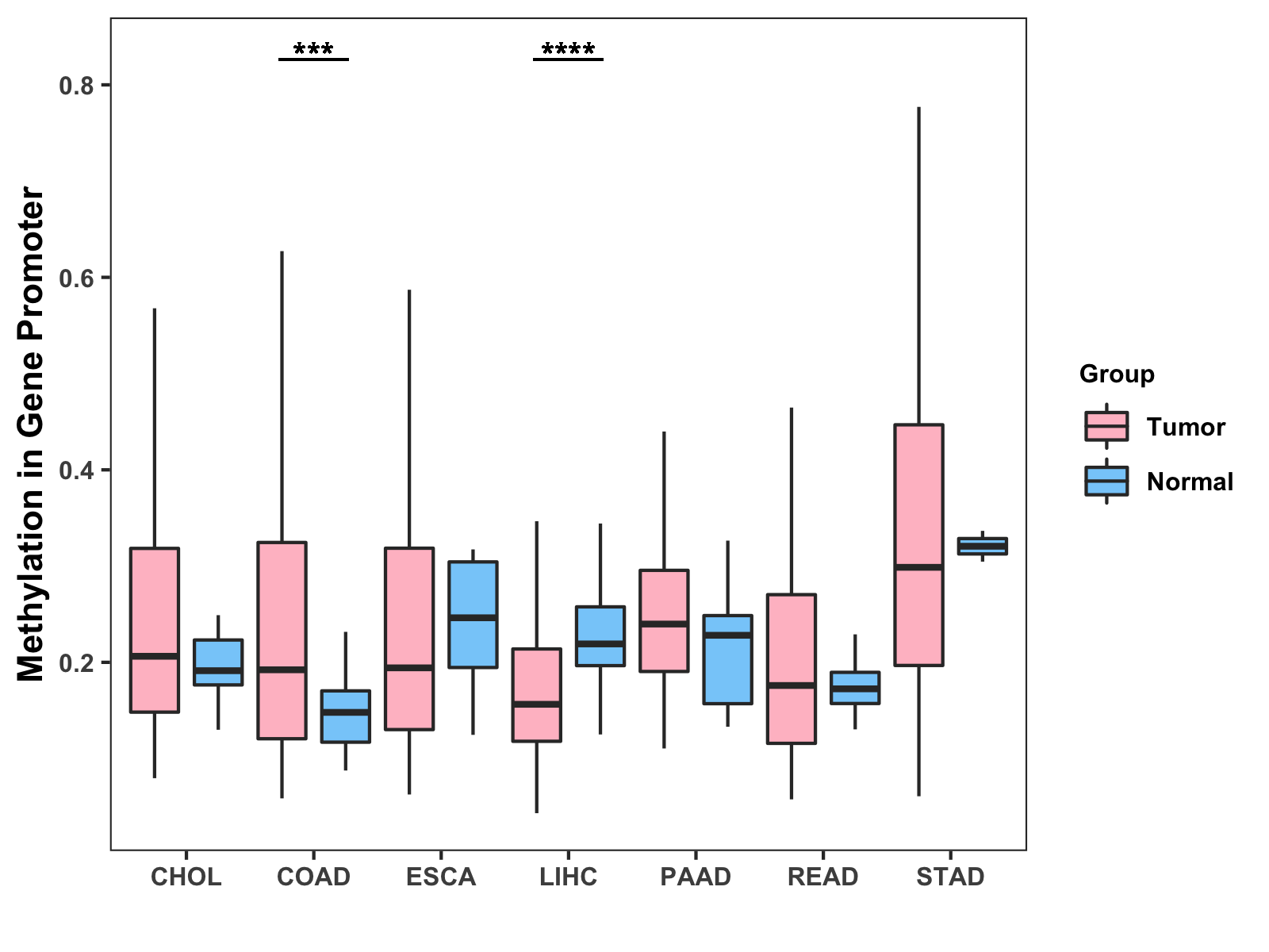 Boxplot of All Gastrointestinal Cancer ( * : 0.01-0.05 , ** : 0.005-0.01 , *** : 0.0001-0.005 , **** : < 0.0001 ) |