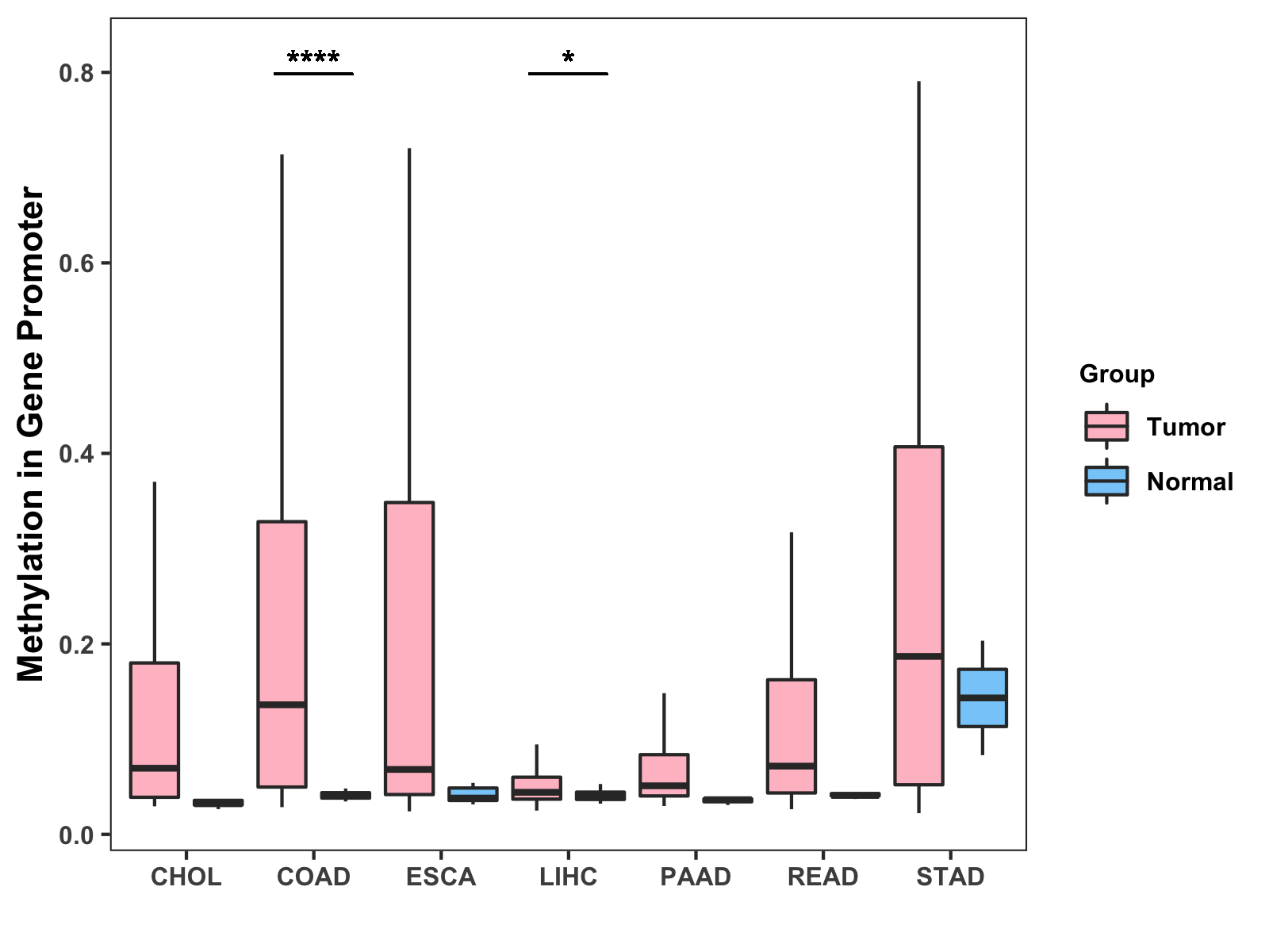 Boxplot of All Gastrointestinal Cancer ( * : 0.01-0.05 , ** : 0.005-0.01 , *** : 0.0001-0.005 , **** : < 0.0001 ) |