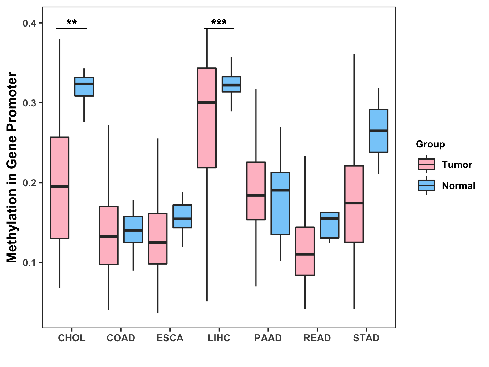 Boxplot of All Gastrointestinal Cancer ( * : 0.01-0.05 , ** : 0.005-0.01 , *** : 0.0001-0.005 , **** : < 0.0001 ) |