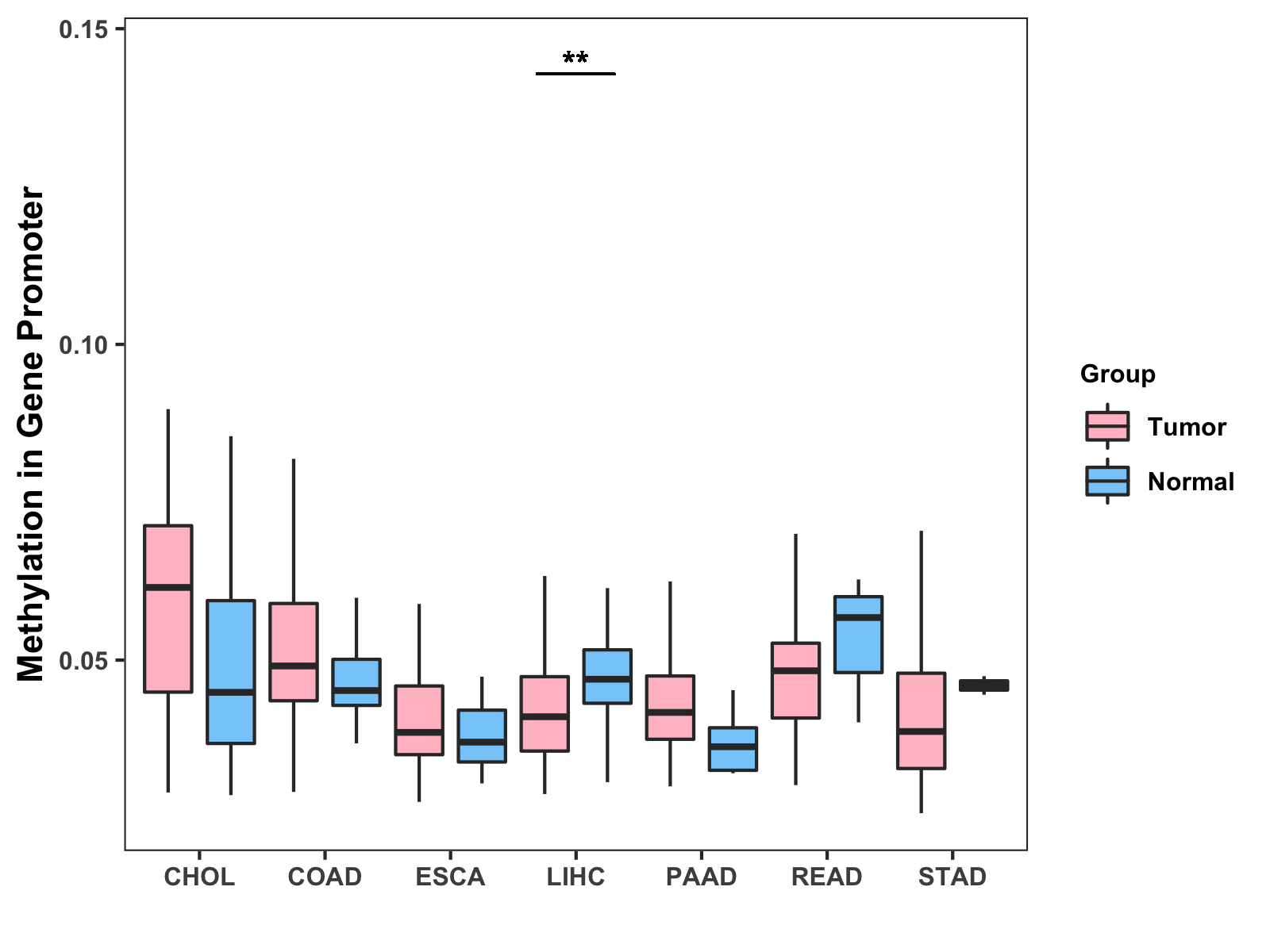 Boxplot of All Gastrointestinal Cancer ( * : 0.01-0.05 , ** : 0.005-0.01 , *** : 0.0001-0.005 , **** : < 0.0001 ) |