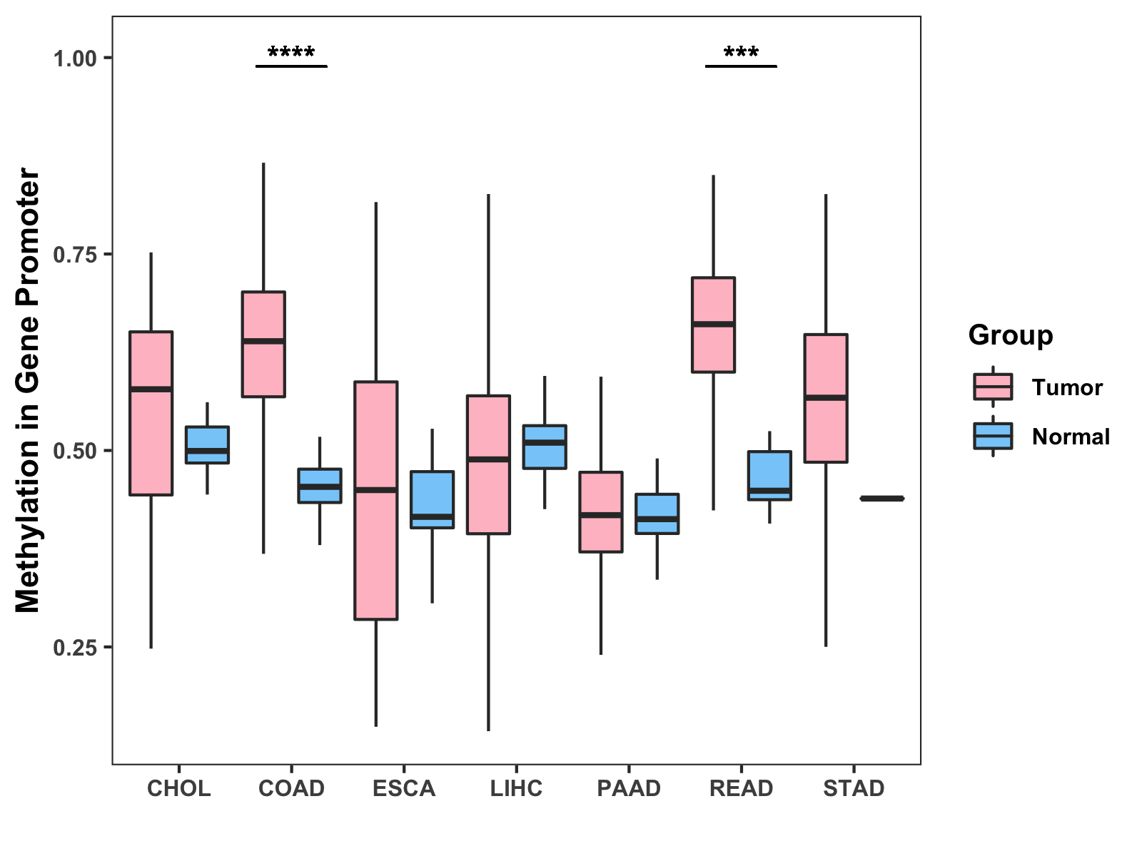 Boxplot of All Gastrointestinal Cancer ( * : 0.01-0.05 , ** : 0.005-0.01 , *** : 0.0001-0.005 , **** : < 0.0001 ) |