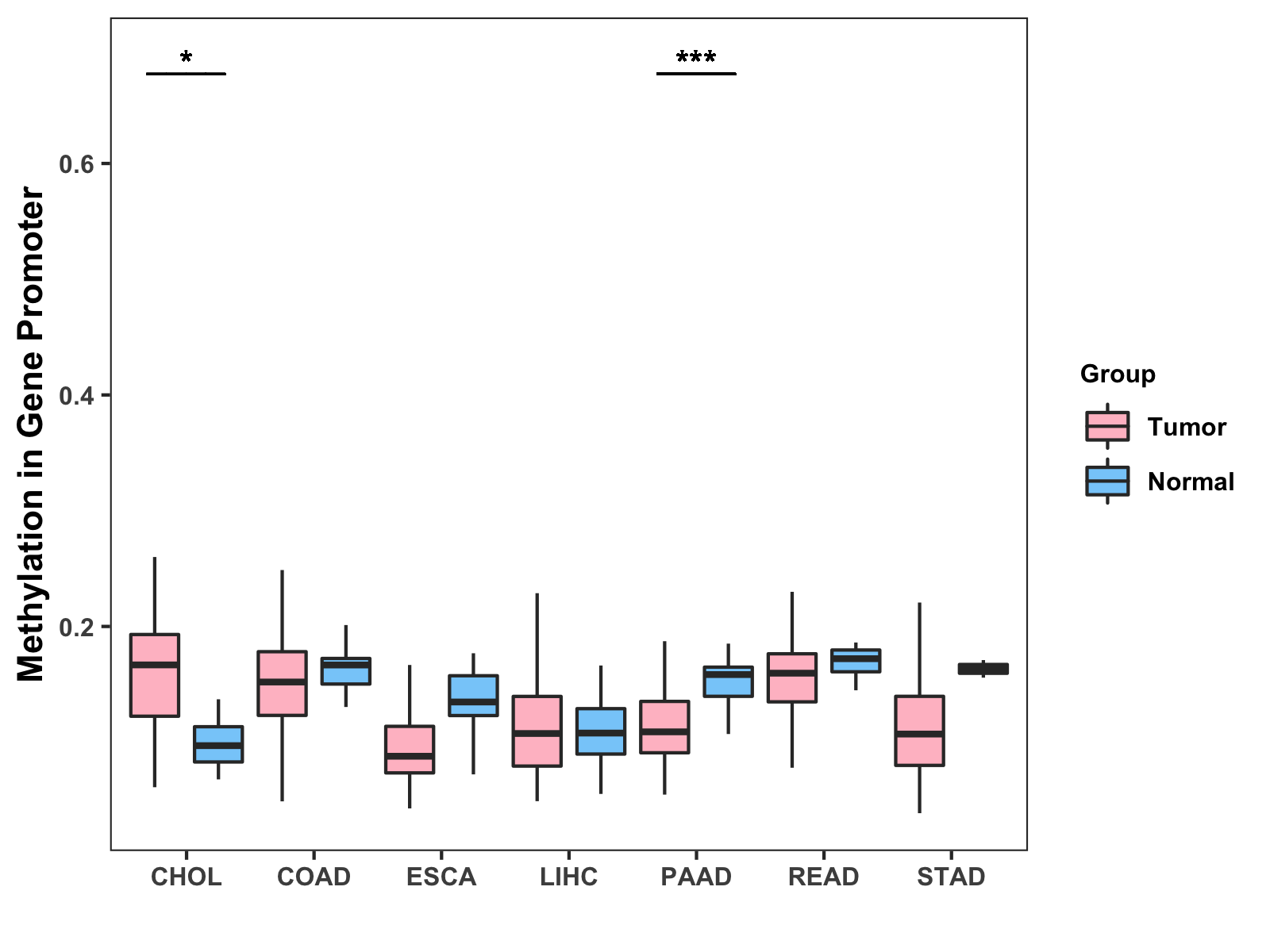 Boxplot of All Gastrointestinal Cancer ( * : 0.01-0.05 , ** : 0.005-0.01 , *** : 0.0001-0.005 , **** : < 0.0001 ) |