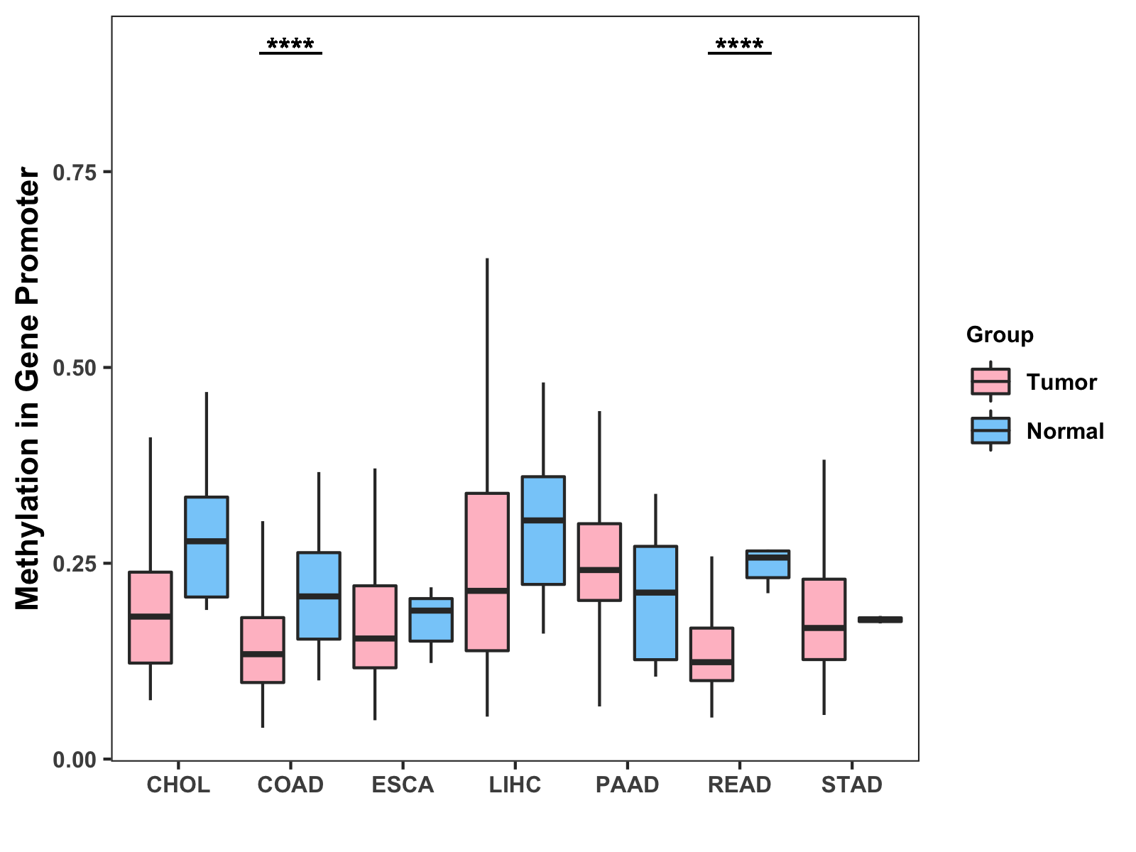 Boxplot of All Gastrointestinal Cancer ( * : 0.01-0.05 , ** : 0.005-0.01 , *** : 0.0001-0.005 , **** : < 0.0001 ) |
