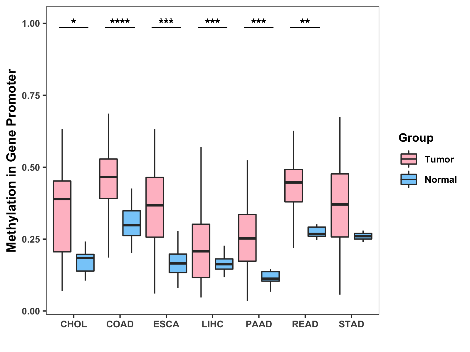 Boxplot of All Gastrointestinal Cancer ( * : 0.01-0.05 , ** : 0.005-0.01 , *** : 0.0001-0.005 , **** : < 0.0001 ) |