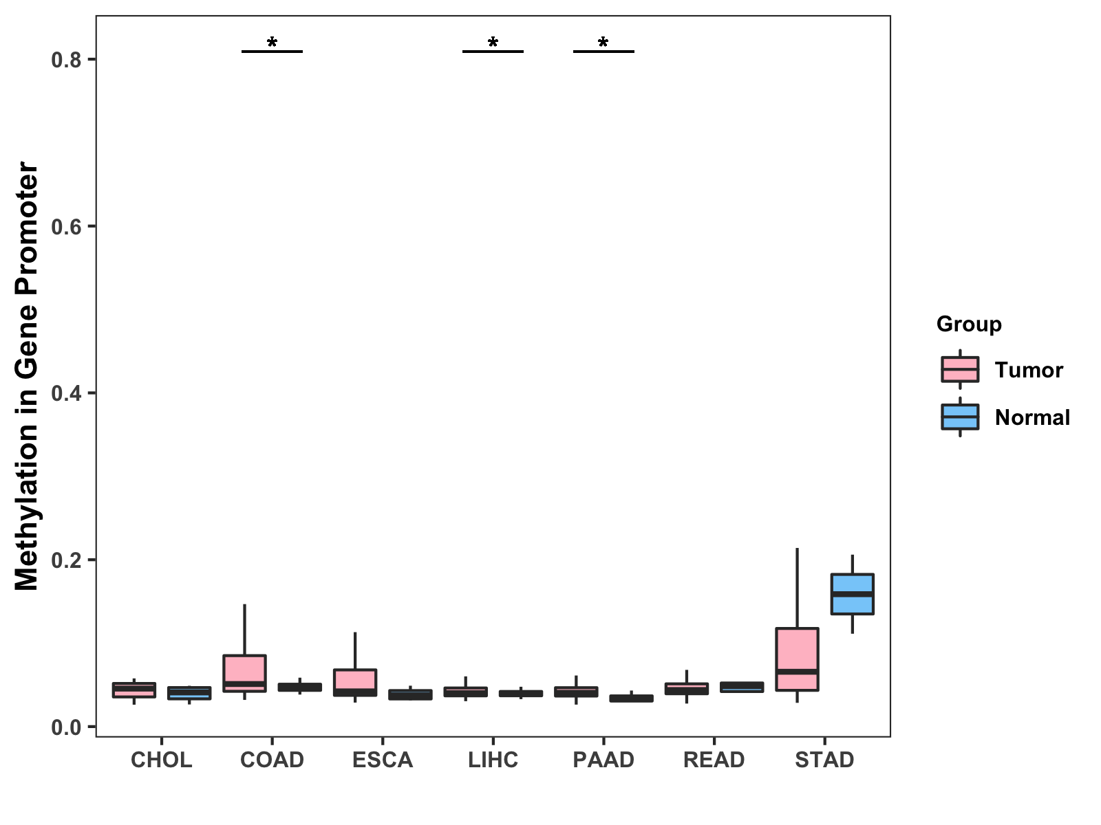 Boxplot of All Gastrointestinal Cancer ( * : 0.01-0.05 , ** : 0.005-0.01 , *** : 0.0001-0.005 , **** : < 0.0001 ) |